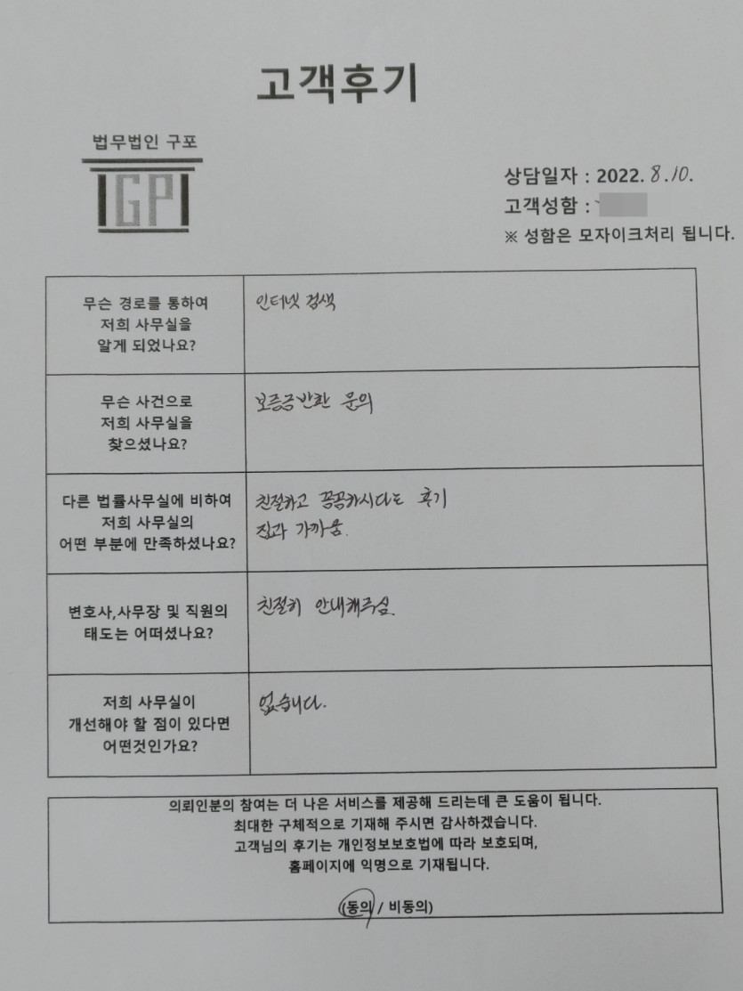 클릭해서 더보기 => <민사 (전세보증금관련 방문상담)> 의뢰인분의 실제 고객후기 페이지 정보 최고관리자 작성일22-08-10 목록 본문 <민사 (전세보증금관련 방문상담)> 의뢰인분의 실제 고객후기( 화면 확대조절 가능합니다. ) 목록
