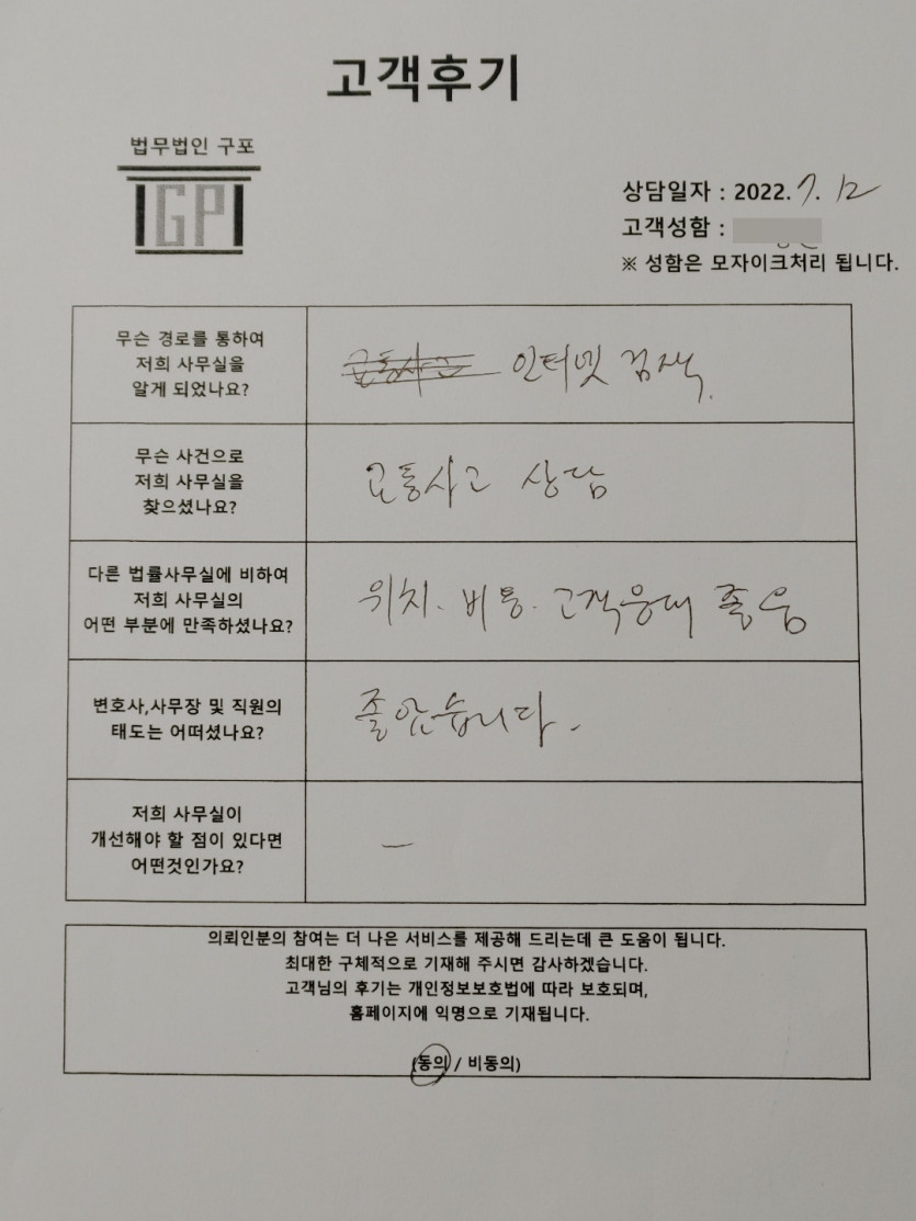 클릭해서 더보기 => <형사 (교통사고) 방문상담> 의뢰인분의 실제 고객후기 페이지 정보 최고관리자 작성일22-07-12 목록 본문 <형사 (교통사고) 방문상담> 의뢰인분의 실제 고객후기 ( 화면 확대조절 가능합니다. ) 목록