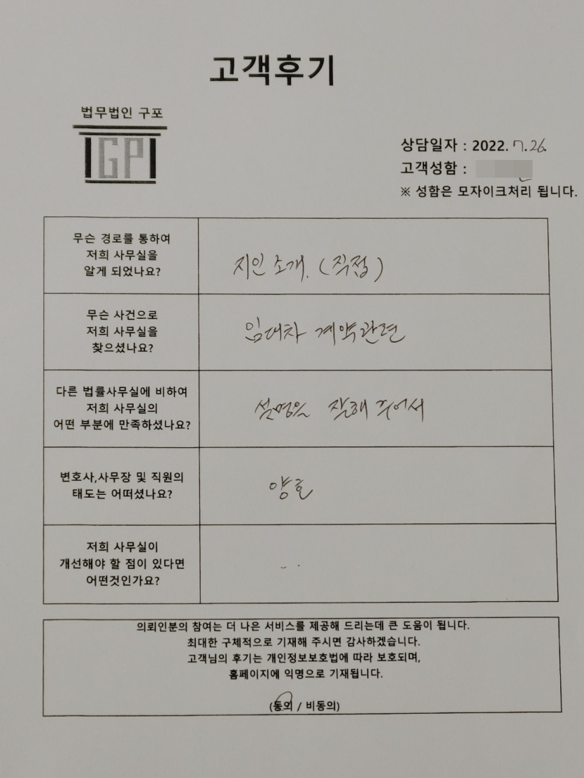 클릭해서 더보기 => <민사 (임대차계약관련) 방문상담> 의뢰인분의 실제 고객후기 페이지 정보 최고관리자 작성일22-07-26 목록 본문 <민사 (임대차계약관련) 방문상담> 의뢰인분의 실제 고객후기 ( 화면 확대조절 가능합니다. ) 목록