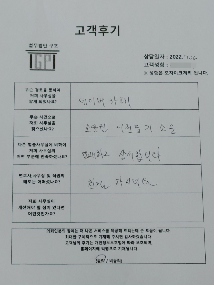 클릭해서 더보기 => <민사 (소유권이전등기소송) 방문상담> 의뢰인분의 실제 고객후기 페이지 정보 최고관리자 작성일22-07-26 목록 본문 <민사 (소유권이전등기소송) 방문상담> 의뢰인분의 실제 고객후기 ( 화면 확대조절 가능합니다. ) 목록