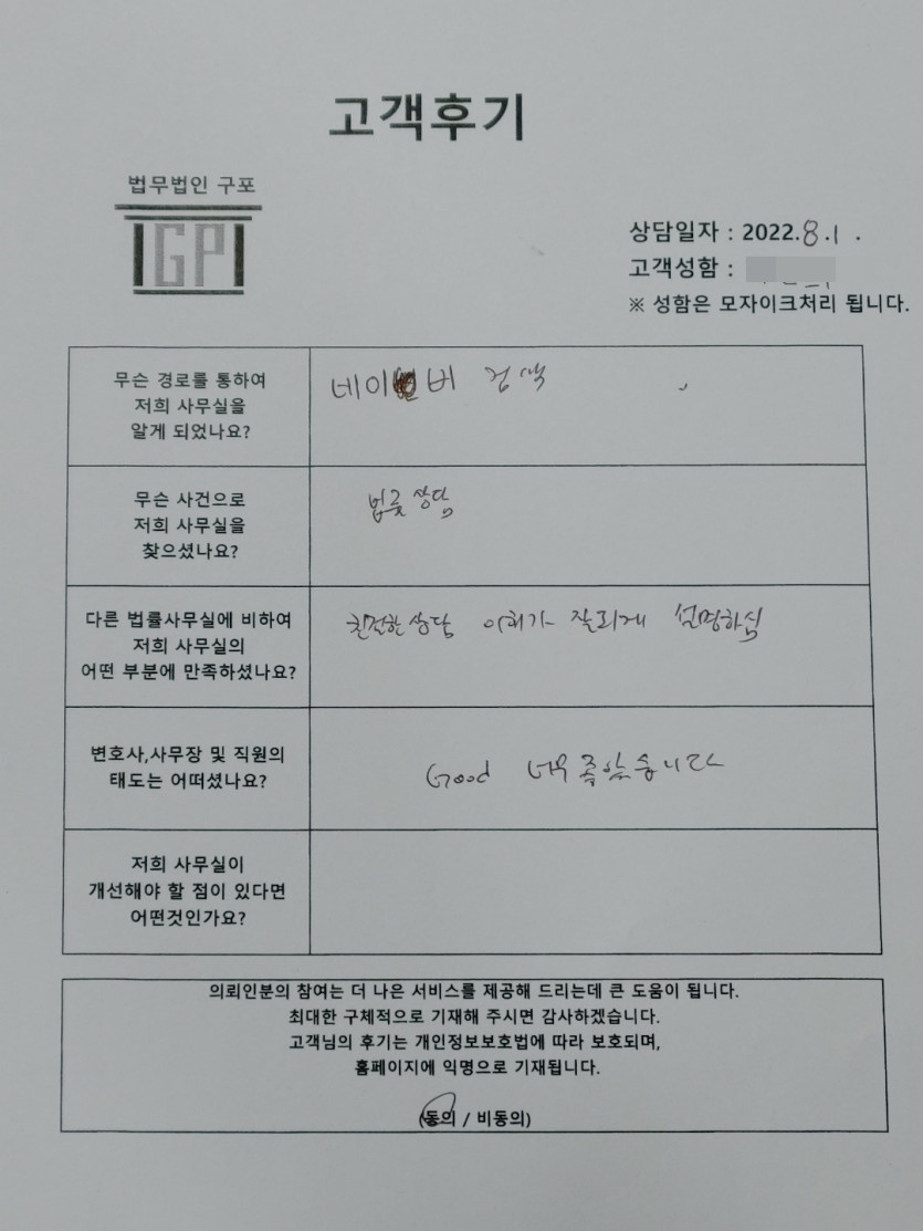 클릭해서 더보기 => <민사 방문상담> 의뢰인분의 실제 고객후기 페이지 정보 최고관리자 작성일22-08-01 목록 본문 <민사 방문상담> 의뢰인분의 실제 고객후기 ( 화면 확대조절 가능합니다. ) 목록