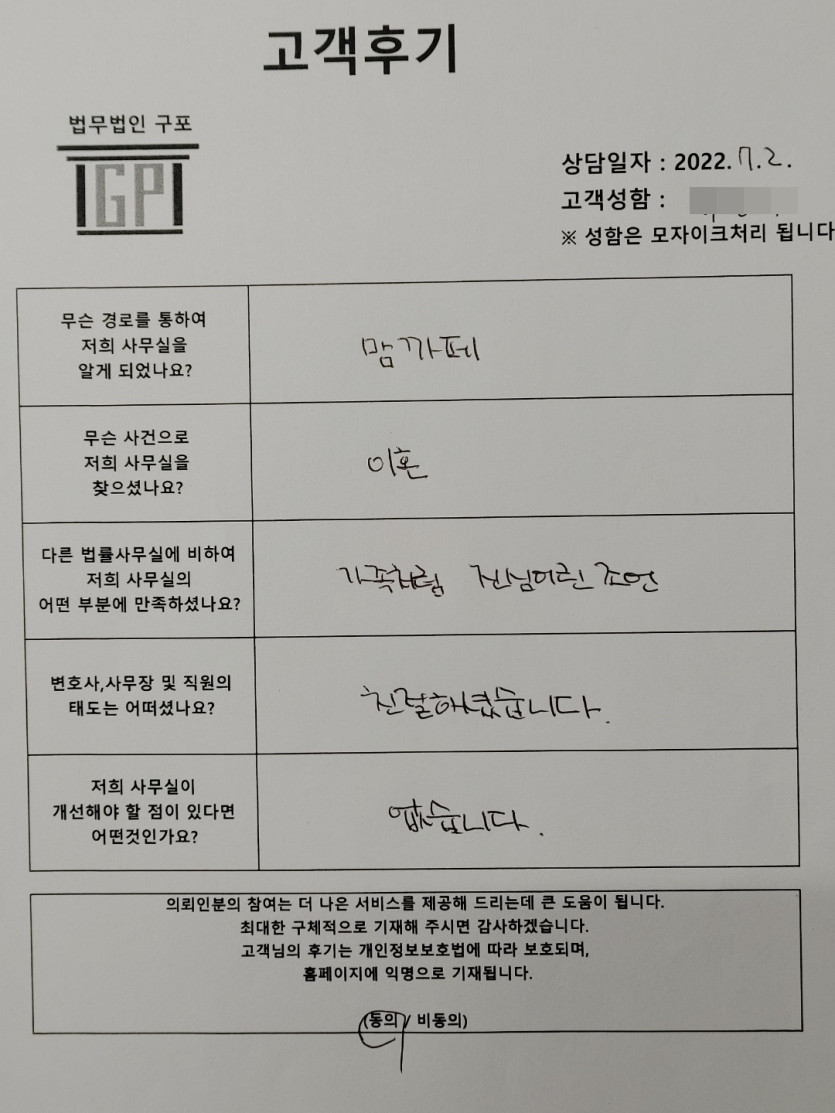클릭해서 더보기 => <민사 (이혼) 방문상담> 의뢰인분의 실제 고객후기 페이지 정보 최고관리자 작성일22-07-06 목록 본문 <민사 (이혼) 방문상담> 의뢰인분의 실제 고객후기 (화면 확대조절 가능합니다.) 목록