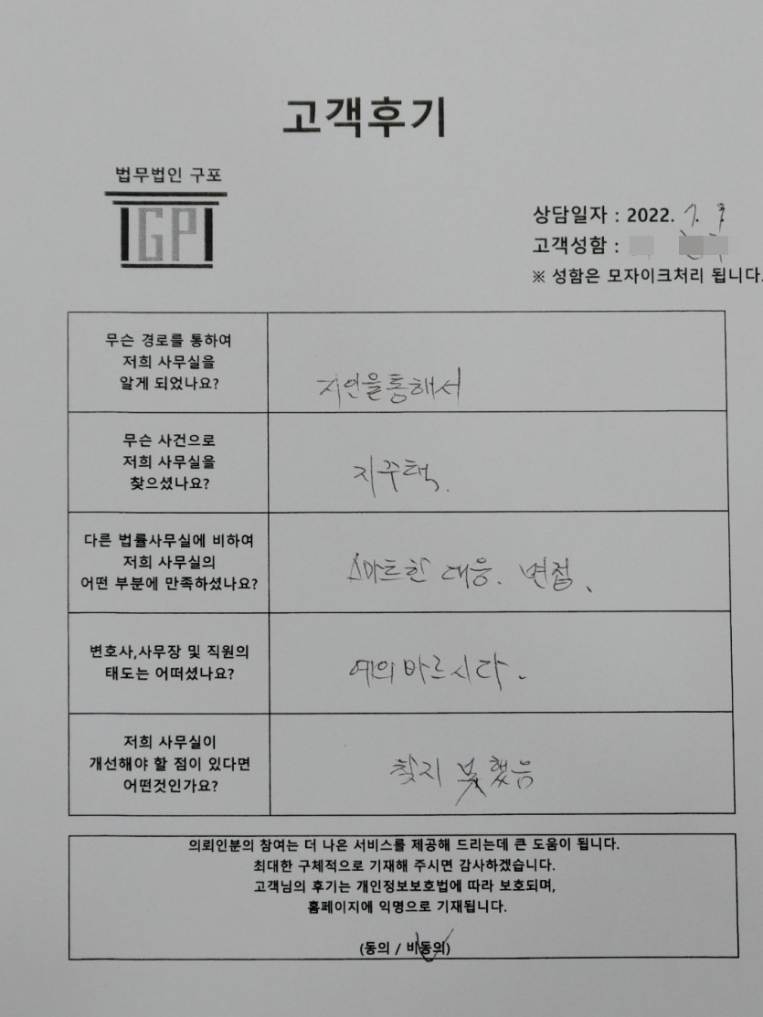 클릭해서 더보기 => <민사 (지역주택조합 [지주택] 방문상담> 의뢰인분의 실제 고객후기 페이지 정보 최고관리자 작성일22-07-11 목록 본문 <민사 (지역주택조합[지주택] 방문상담> 의뢰인분의 실제 고객후기 (화면 확대조절 가능합니다.) 목록