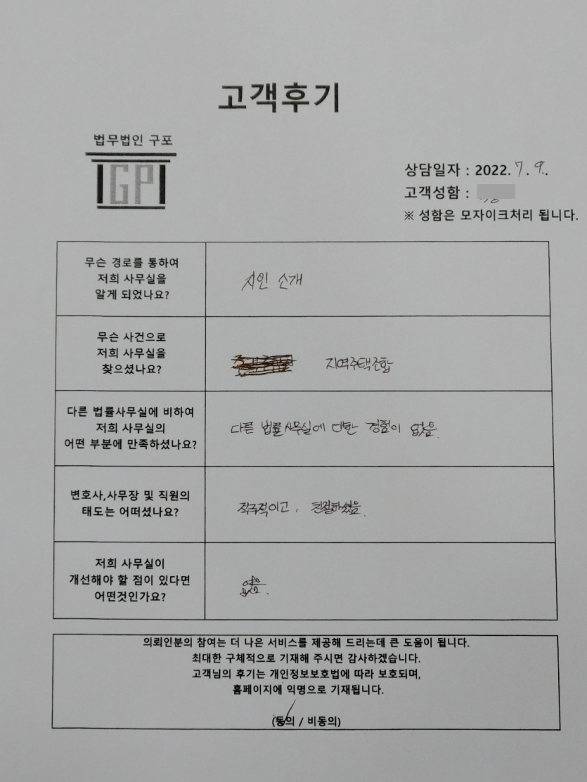 클릭해서 더보기 => <민사 (지역주택조합[지주택탈퇴] 방문상담> 의뢰인분의 실제 고객후기 페이지 정보 최고관리자 작성일22-07-11 목록 본문 <민사 (지역주택조합[지주택탈퇴] 방문상담> 의뢰인분의 실제 고객후기 (화면 확대조절 가능합니다.) 목록