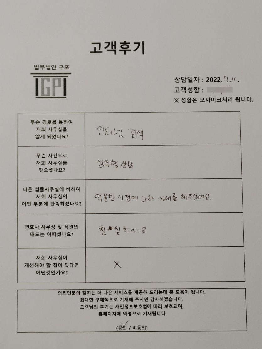 클릭해서 더보기 => <형사 (성범죄_성추행) 방문상담> 의뢰인분의 실제 고객후기 페이지 정보 최고관리자 작성일22-07-11 목록 본문 <형사 (성추행) 방문상담> 의뢰인분의 실제 고객후기 (화면 확대조절 가능합니다.) 목록