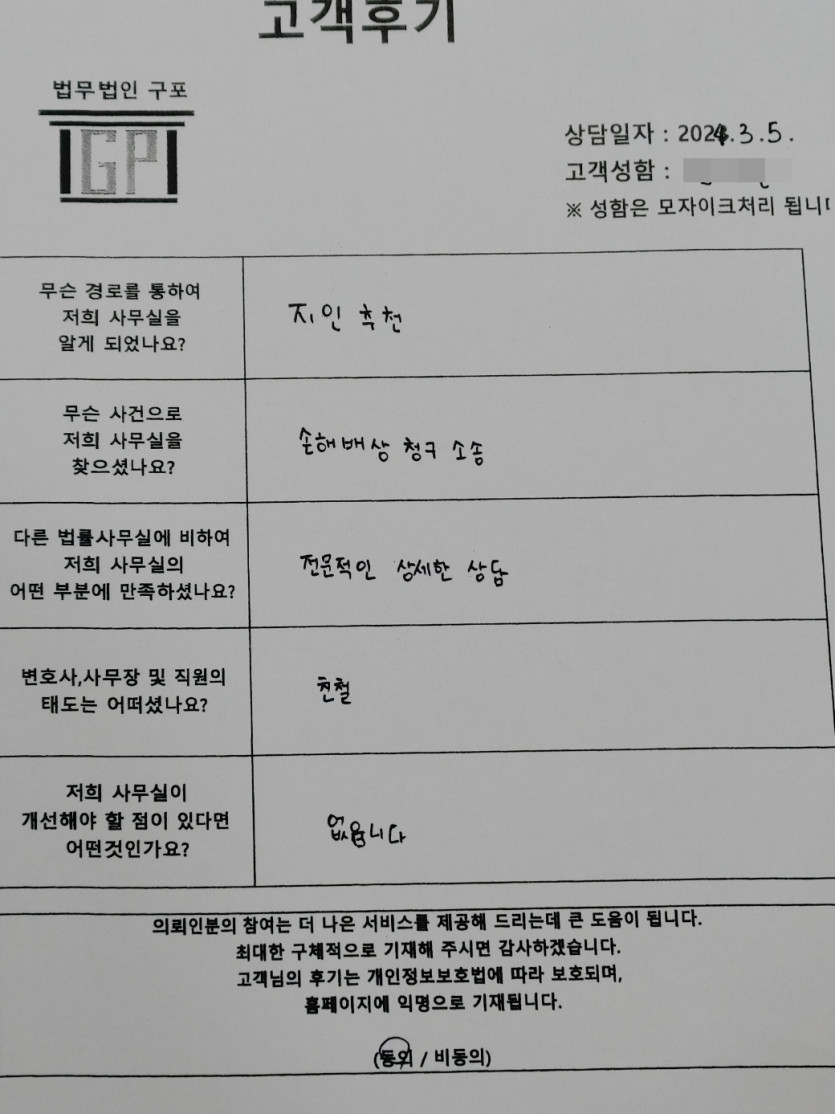 [민사] 손해배상청구소송 - 의뢰인분의 실제 고객후기