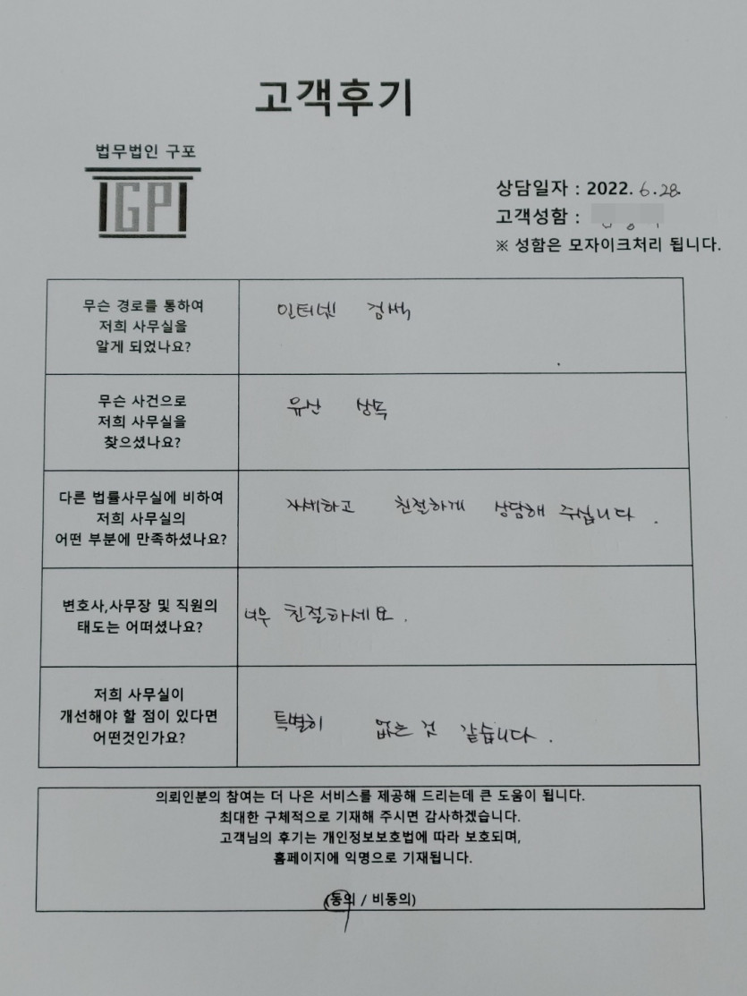 클릭해서 더보기 => < 민사 (유산상속) 방문상담> 의뢰인분의 실제 고객후기 페이지 정보 최고관리자 작성일22-06-28 목록 본문 < 민사 (유산상속) 방문상담> 의뢰인분의 실제 고객후기(화면 확대조절 가능합니다.) 목록