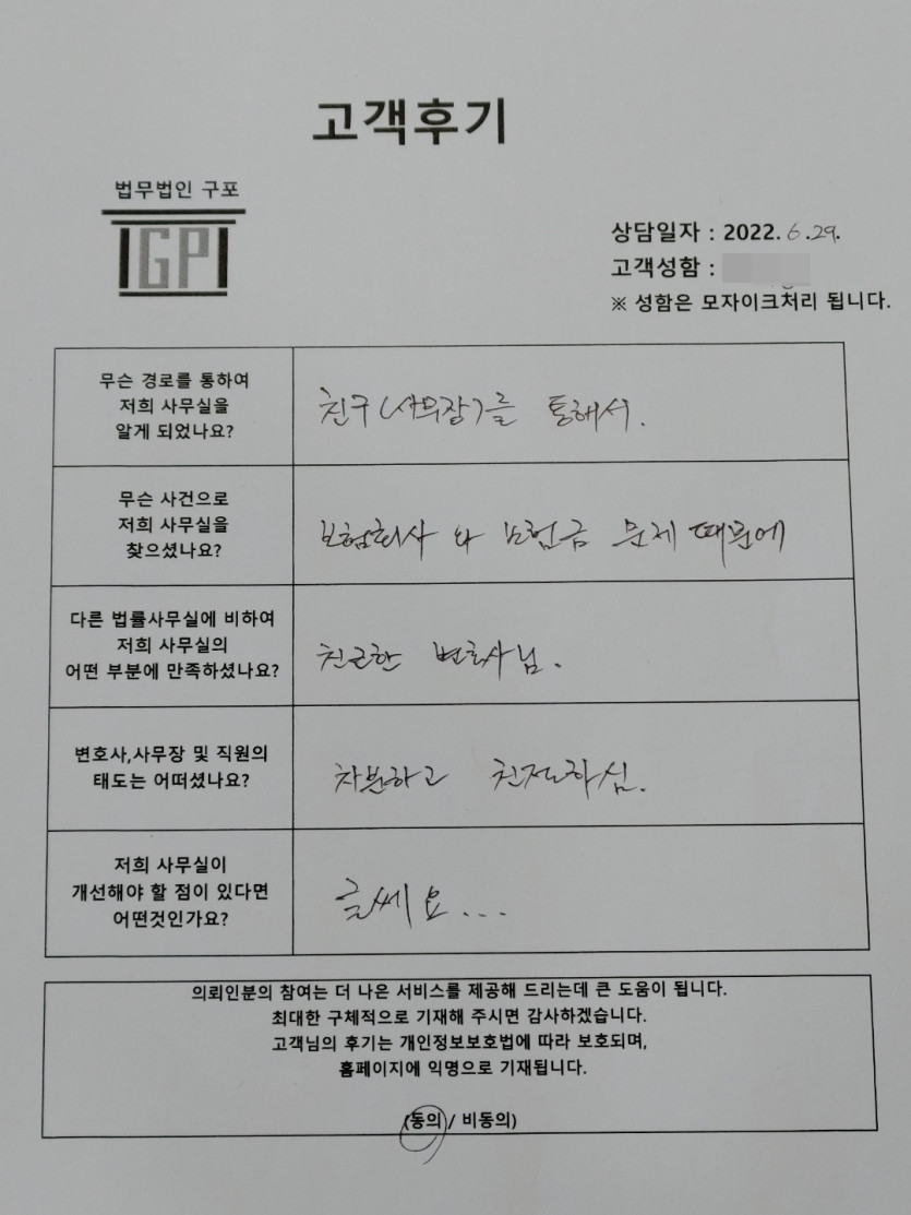 클릭해서 더보기 => < 민사 (보험금관련) 방문상담> 의뢰인분의 실제 고객후기 페이지 정보 최고관리자 작성일22-06-29 목록 본문 < 민사 (보험금관련) 방문상담> 의뢰인분의 실제 고객후기 (화면 확대조절 가능합니다.) 목록