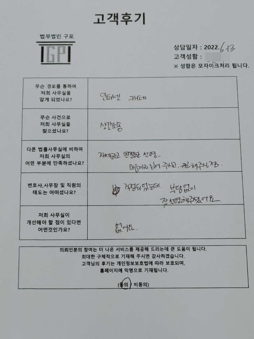 클릭해서 더보기 => < 민사 (이혼 및 상간소송) 방문상담> 의뢰인분의 실제 고객후기 페이지 정보 최고관리자 작성일22-06-13 목록 본문 < 민사 (이혼 및 상간소송) 방문상담> 의뢰인분의 실제 고객후기(화면 확대조절 가능합니다.) 목록