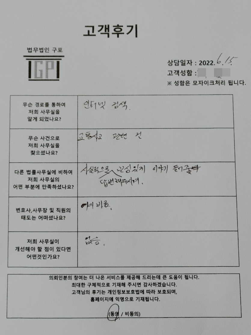 클릭해서 더보기 => < 형사 (교통사고) 방문상담> 의뢰인분의 실제 고객후기 페이지 정보 최고관리자 작성일22-06-15 목록 본문 < 형사 (교통사고) 방문상담> 의뢰인분의 실제 고객후기(화면 확대조절 가능합니다.) 목록
