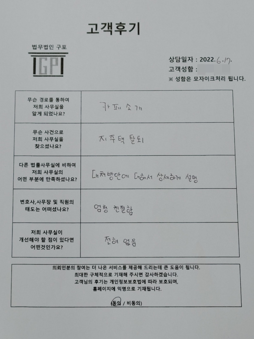 클릭해서 더보기 => < 민사 (지역주택조합[지주택탈퇴] 방문상담> 의뢰인분의 실제 고객후기 페이지 정보 최고관리자 작성일22-06-17 목록 본문 <민사 (지역주택조합[지주택탈퇴] 방문상담> 의뢰인분의 실제 고객후기(화면 확대조절 가능합니다.) 목록