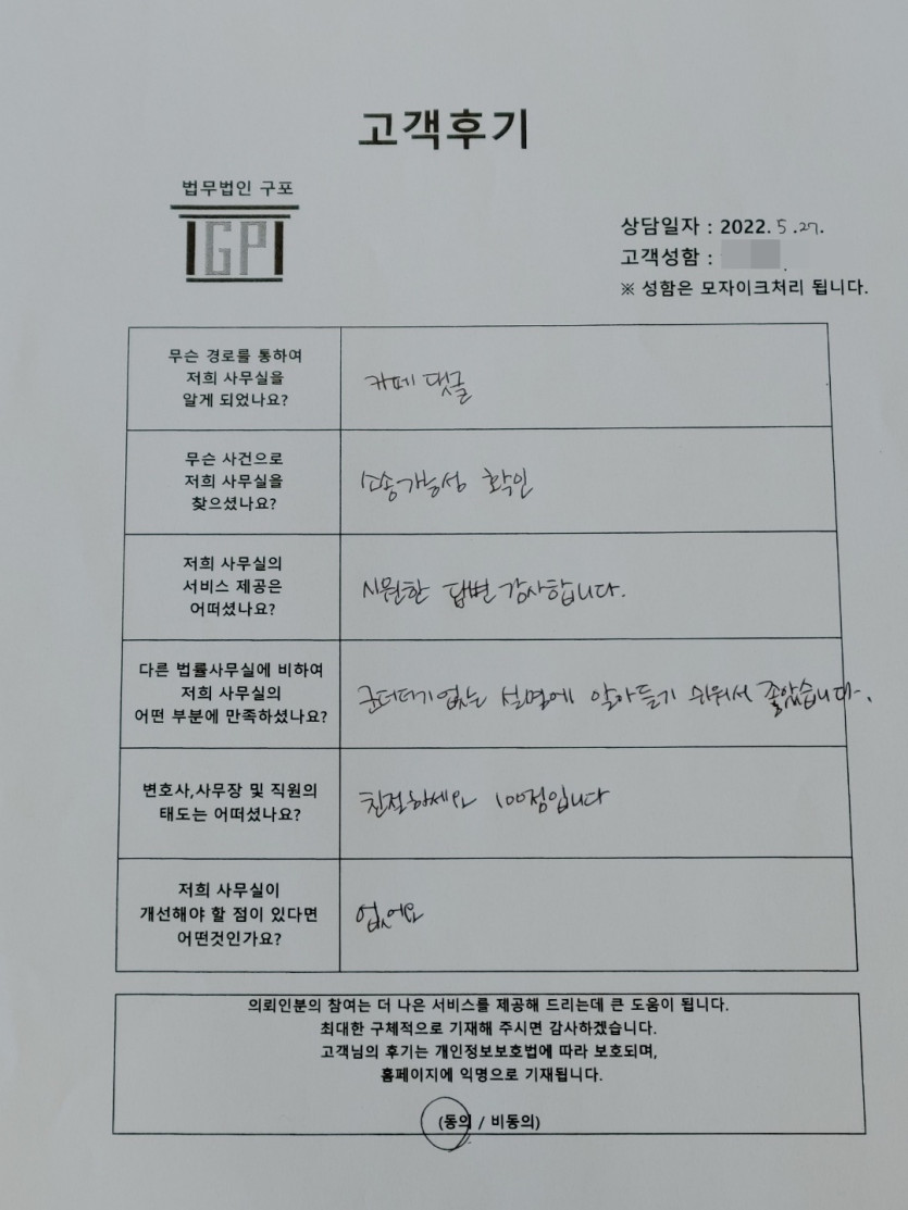 클릭해서 더보기 => <민사 (퇴직금소송문의) 방문상담> 의뢰인분의 실제 고객후기 페이지 정보 최고관리자 작성일22-05-27 목록 본문 <민사 (퇴직금소송문의) 방문상담> 의뢰인분의 실제 고객후기 (화면 확대조절 가능합니다.) 목록