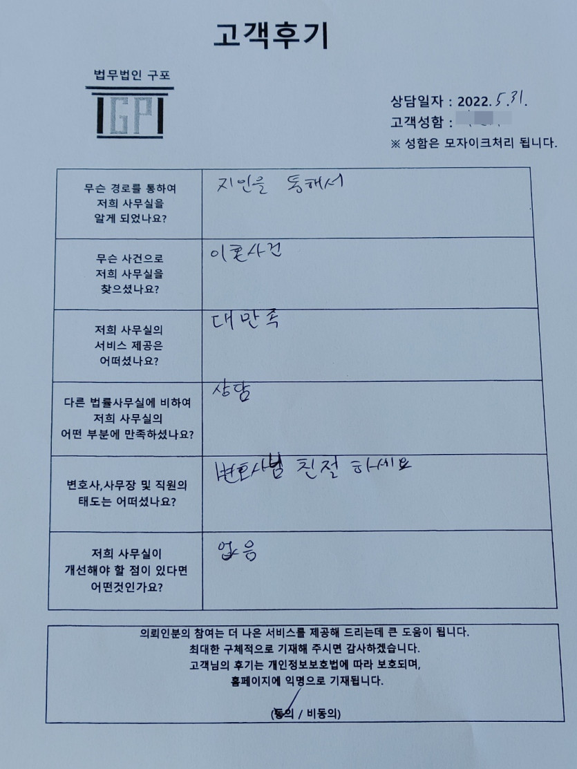 클릭해서 더보기 => <민사 (이혼) 방문상담> 의뢰인분의 실제 고객후기 페이지 정보 최고관리자 작성일22-05-31 목록 본문 <민사 (이혼) 방문상담>의뢰인분의 실제 고객후기(화면 확대조절 가능합니다) 목록