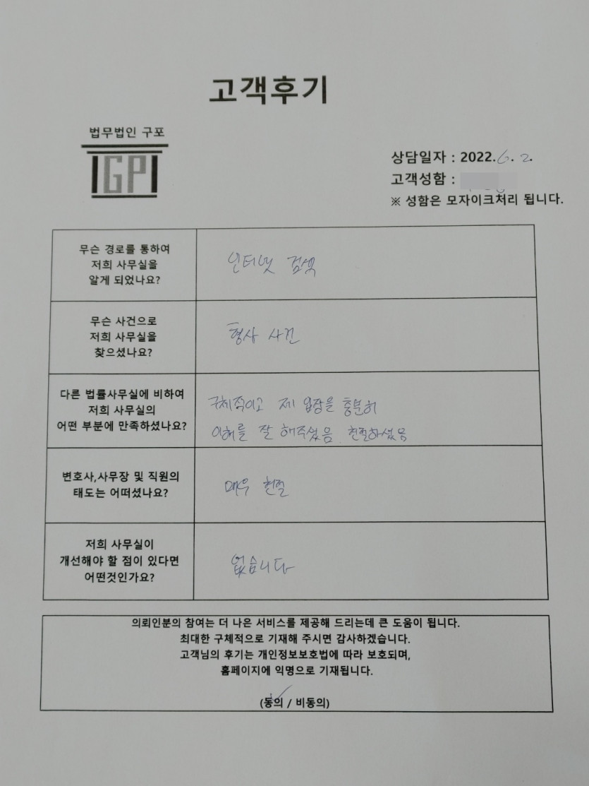 클릭해서 더보기 => <형사 (성범죄_성추행관련) 방문상담> 의뢰인분의 실제 고객후기 페이지 정보 최고관리자 작성일22-06-02 목록 본문 <형사 (성추행관련) 방문상담> 의뢰인분의 실제 고객후기 (화면 확대조절 가능합니다.) 목록