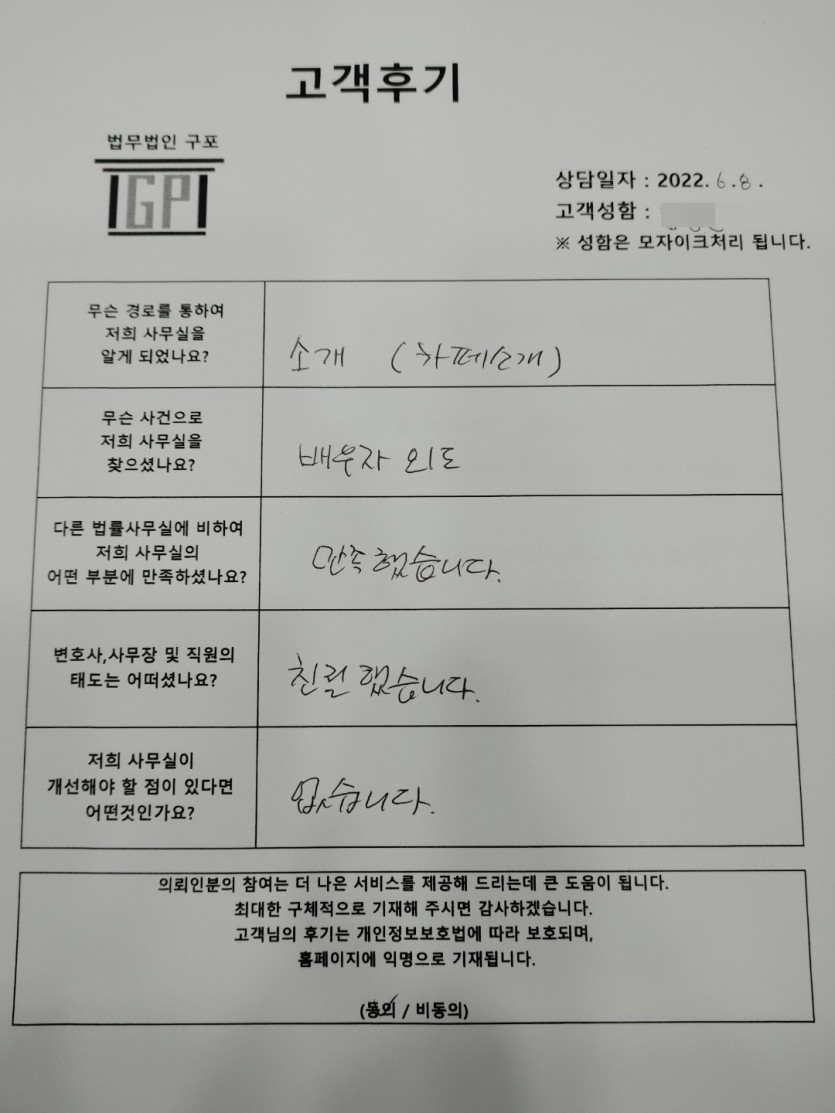 클릭해서 더보기 => <민사 (이혼,배우자의외도) 방문상담> 의뢰인분의 실제 고객후기 페이지 정보 최고관리자 작성일22-06-08 목록 본문 <민사 (이혼,배우자의외도) 방문상담> 의뢰인분의 실제 고객후기(화면 확대조절 가능합니다.) 목록