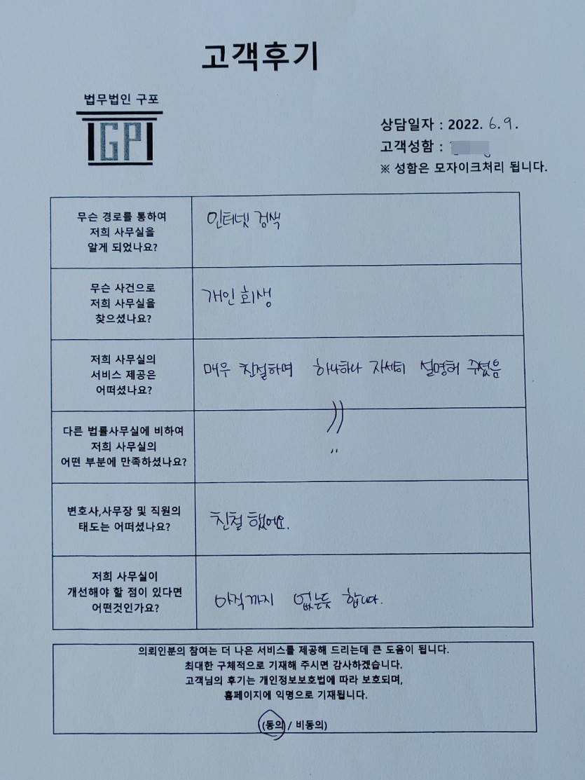 클릭해서 더보기 => <개인회생 방문상담> 의뢰인분의 실제 고객후기 페이지 정보 최고관리자 작성일22-06-09 목록 본문 <개인회생 방문상담>의뢰인분의 실제 고객후기 (화면 확대조절 가능합니다.) 목록