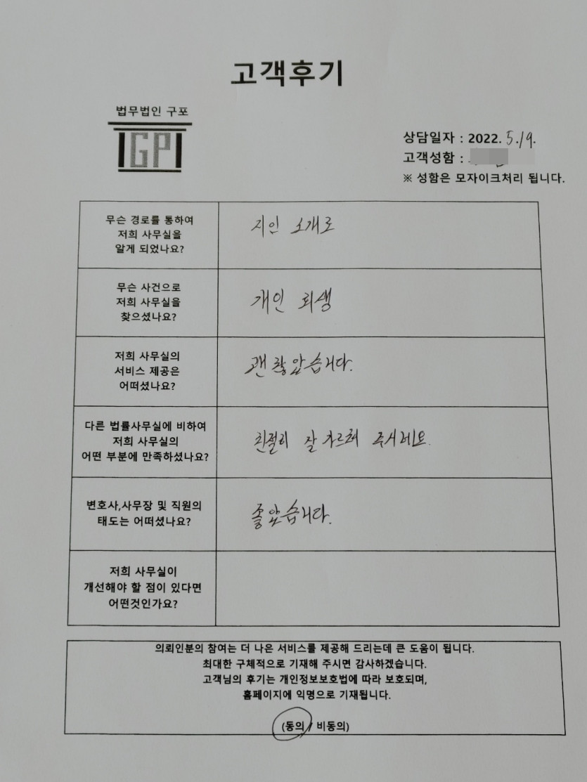클릭해서 더보기 => <개인회생 방문상담> 의뢰인분의 실제 고객후기 페이지 정보 최고관리자 작성일22-05-19 목록 본문 <개인회생 방문상담> 의뢰인분의 실제 고객후기 (화면 확대조절 가능합니다) 목록