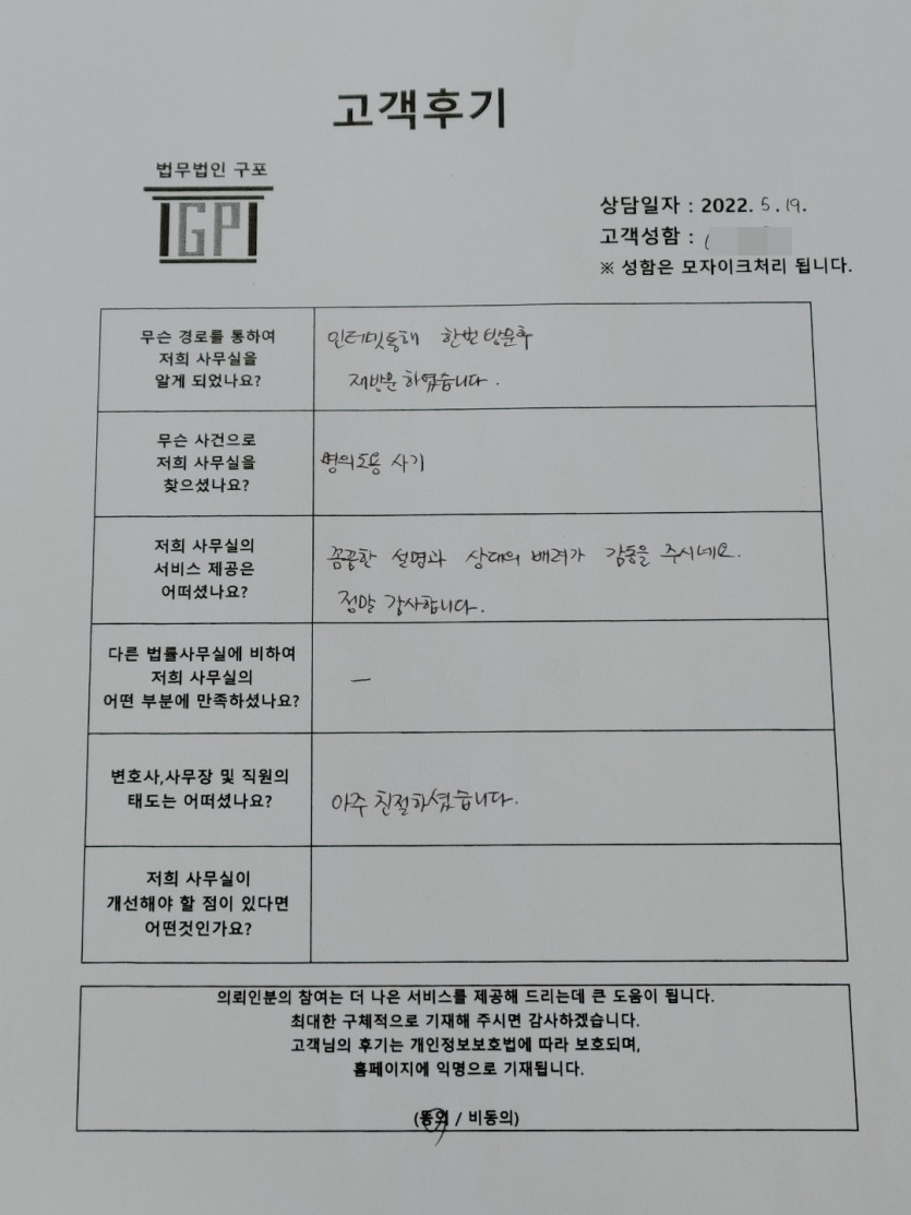 클릭해서 더보기 => <민사 (명의도용사기) 방문상담> 의뢰인분의 실제 고객후기 페이지 정보 최고관리자 작성일22-05-19 목록 본문 <민사 (명의도용사기) 방문상담> 의뢰인분의 실제 고객후기 (화면 확대조절 가능합니다) 목록