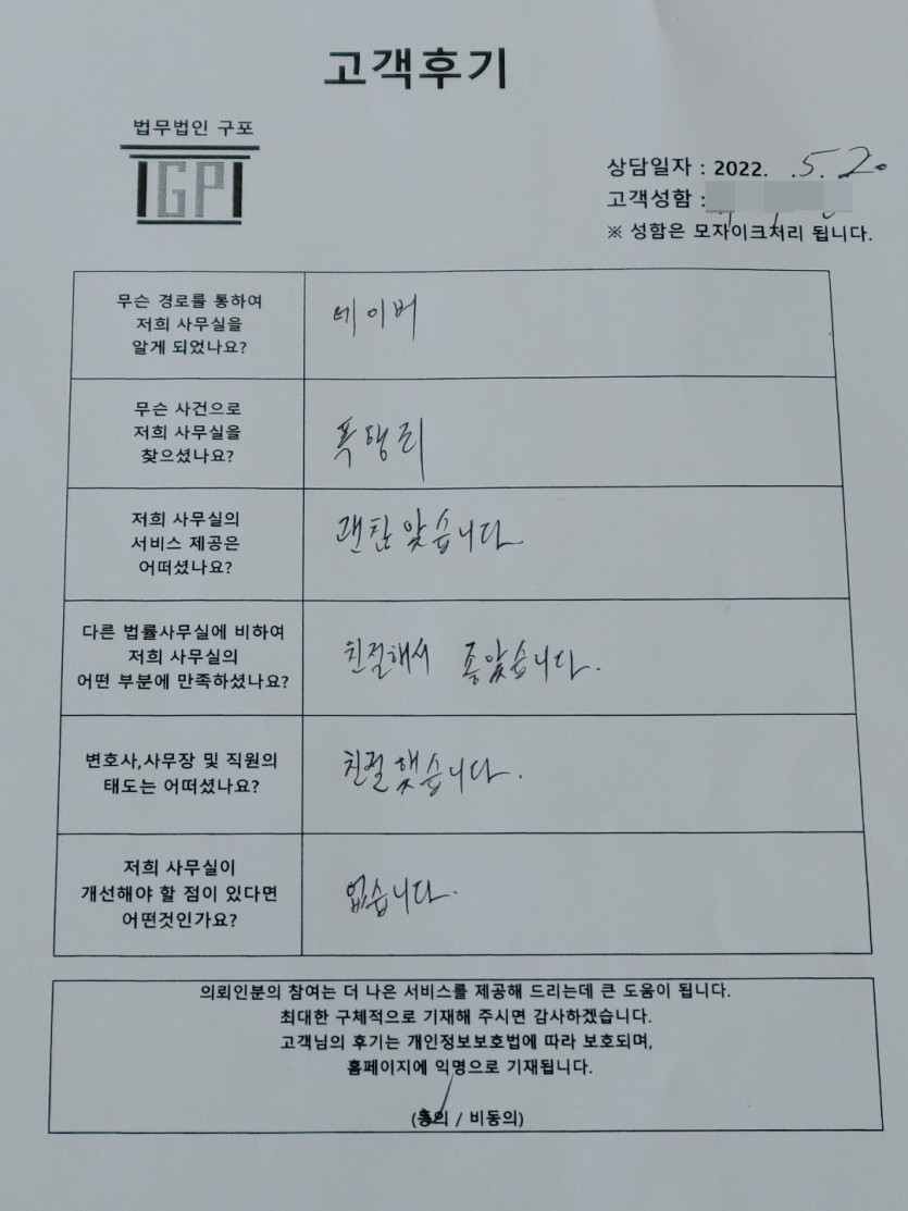 클릭해서 더보기 => <형사 (폭행죄) 방문상담> 의뢰인분의 실제 고객후기 페이지 정보 최고관리자 작성일22-05-20 목록 본문 <형사 (폭행죄) 방문상담> 의뢰인분의 실제 고객후기 (화면 확대조절 가능합니다) 목록