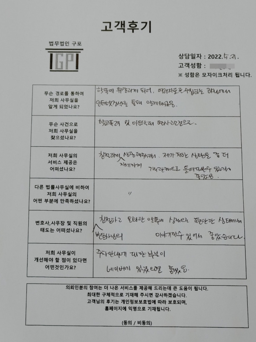 클릭해서 더보기 => < 민사(학교폭력 및 아동학대) 방문상담> 의뢰인분의 실제 고객후기 페이지 정보 최고관리자 작성일22-05-24 목록 본문 < 민사(학교폭력 및 아동학대) 방문상담> 의뢰인분의 실제 고객후기 (화면 확대조절 가능합니다) 목록