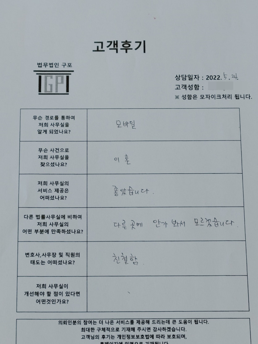 클릭해서 더보기 => <민사 (이혼) 방문상담> 의뢰인분의 실제 고객후기 페이지 정보 최고관리자 작성일22-05-24 목록 본문 <민사 (이혼) 방문상담> 의뢰인분의 실제 고객후기 (화면 확대조절 가능합니다) 목록