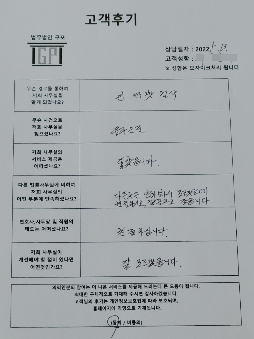 클릭해서 더보기 => < 형사 (음주운전) 방문상담> 의뢰인분의 실제 고객후기 페이지 정보 최고관리자 작성일22-05-13 목록 본문 < 형사 (음주운전) 방문상담> 의뢰인분의 실제 고객후기 (화면 확대조절 가능합니다) 목록