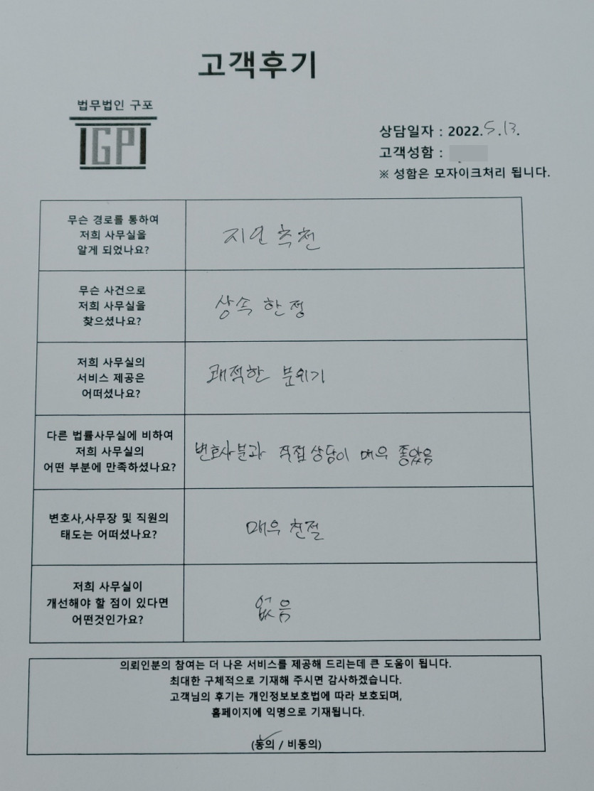 클릭해서 더보기 => <민사 (상속한정) 방문상담> 의뢰인분의 실제 고객후기 페이지 정보 최고관리자 작성일22-05-13 목록 본문 <민사 (상속한정) 방문상담> 의뢰인분의 실제 고객후기 (화면 확대조절 가능합니다) 목록