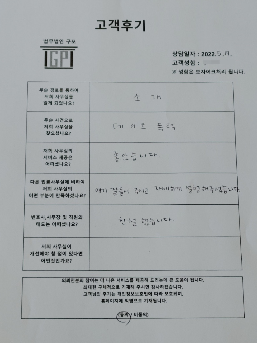 클릭해서 더보기 => <형사 (데이트폭력) 방문상담> 의뢰인분의 실제 고객후기 페이지 정보 최고관리자 작성일22-05-17 목록 본문 <형사 (데이트폭력) 방문상담> 의뢰인분의 실제 고객후기 (화면 확대조절 가능합니다) 목록