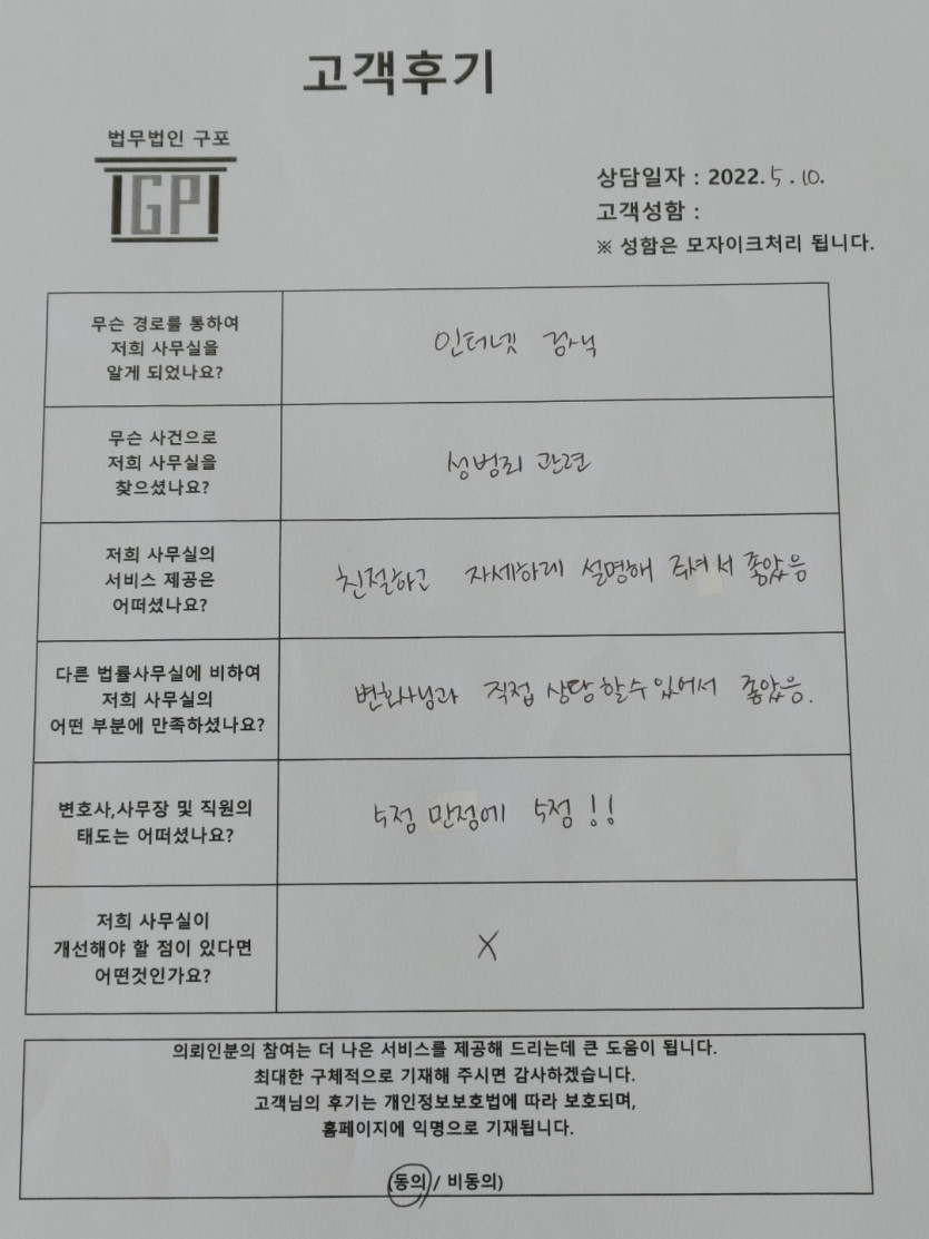 클릭해서 더보기 => <형사 (성범죄) 방문상담> 의뢰인분의 실제 고객후기 페이지 정보 최고관리자 작성일22-05-10 목록 본문 <형사 (성범죄) 방문상담> 의뢰인분의 실제 고객후기 (화면 확대조절 가능합니다) 목록