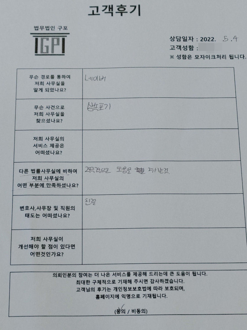 클릭해서 더보기 => < 민사 (상속포기) 방문상담> 의뢰인분들의 실제 고객후기 페이지 정보 최고관리자 작성일22-05-04 목록 본문 <민사 (상속포기) 방문상담> 의뢰인분들의 실제 고객후기 (화면 확대조절 가능합니다) 목록