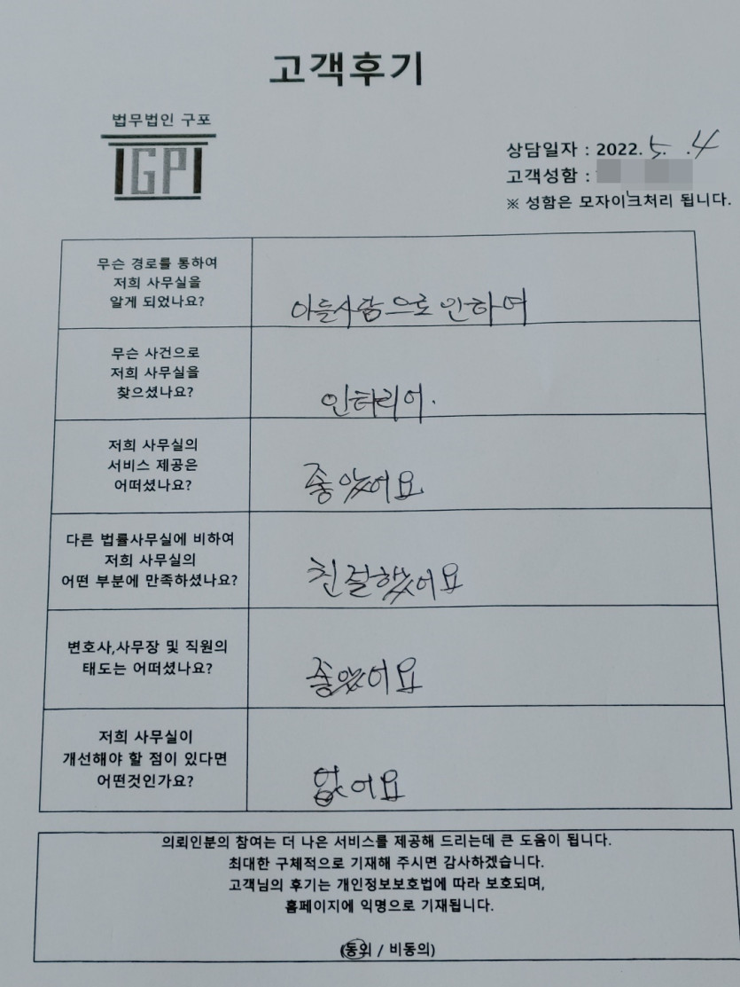 클릭해서 더보기 => <민사 (인테리어공사) 방문상담> 의뢰인분의 실제 고객후기 페이지 정보 최고관리자 작성일22-05-04 목록 본문 <민사 (인테리어공사) 방문상담> 의뢰인분의 실제 고객후기 (화면 확대조절 가능합니다) 목록