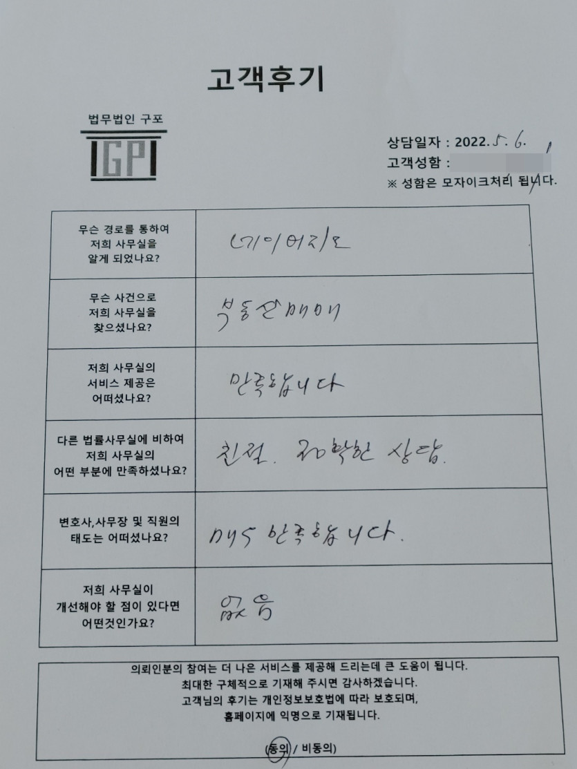 클릭해서 더보기 => <민사 (부동산매매) 방문상담> 의뢰인분의 실제 고객후기 페이지 정보 최고관리자 작성일22-05-06 목록 본문 <민사 (부동산매매) 방문상담> 의뢰인분의 실제 고객후기 (화면 확대조절 가능합니다) 목록