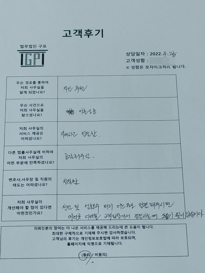 클릭해서 더보기 => <민사 (이혼) 방문상담> 의뢰인분의 실제 고객후기 페이지 정보 최고관리자 작성일22-04-27 목록 본문 <민사 (이혼) 방문상담> 의뢰인분의 실제 고객후기 (화면 확대 조절 가능합니다) 목록