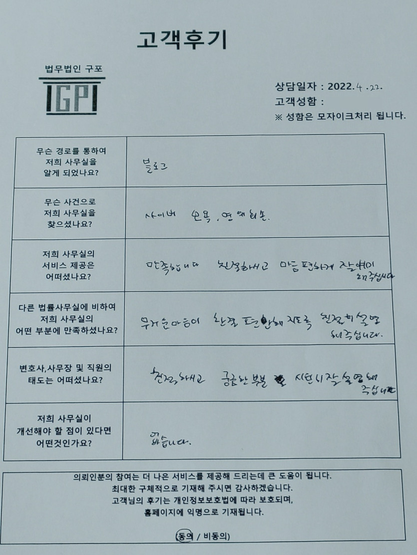 클릭해서 더보기 => <형사 (사이버모욕죄, 명예훼손) 방문상담> 의뢰인분의 실제 고객후기 페이지 정보 최고관리자 작성일22-04-27 목록 본문 <형사 (사이버모욕죄, 명예훼손) 방문상담> 의뢰인분의 실제 고객후기 (화면 확대 조절 가능합니다) 목록
