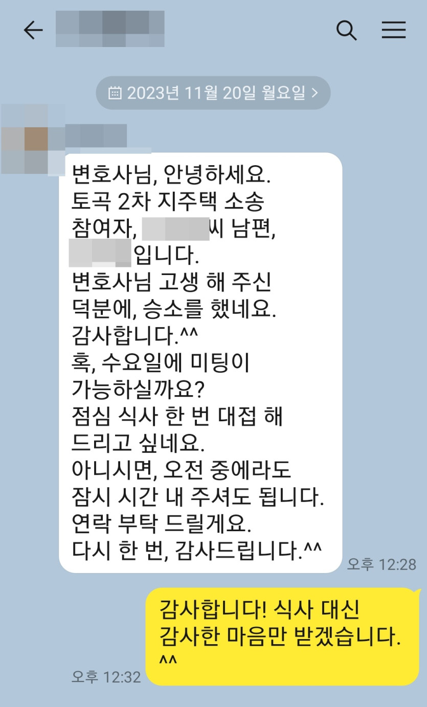 부산 토곡지역주택조합(지주택 탈퇴) 의뢰인분의 실제 감사후기 페이지 정보 최고관리자 작성일23-12-06 목록 본문 안녕하세요. 법무법인 구포입니다.부산 토곡지역주택조합탈퇴 의뢰인분께서 지주택 소송 판결 이후 감사 후기를 남겨주셨습니다.~ 목록