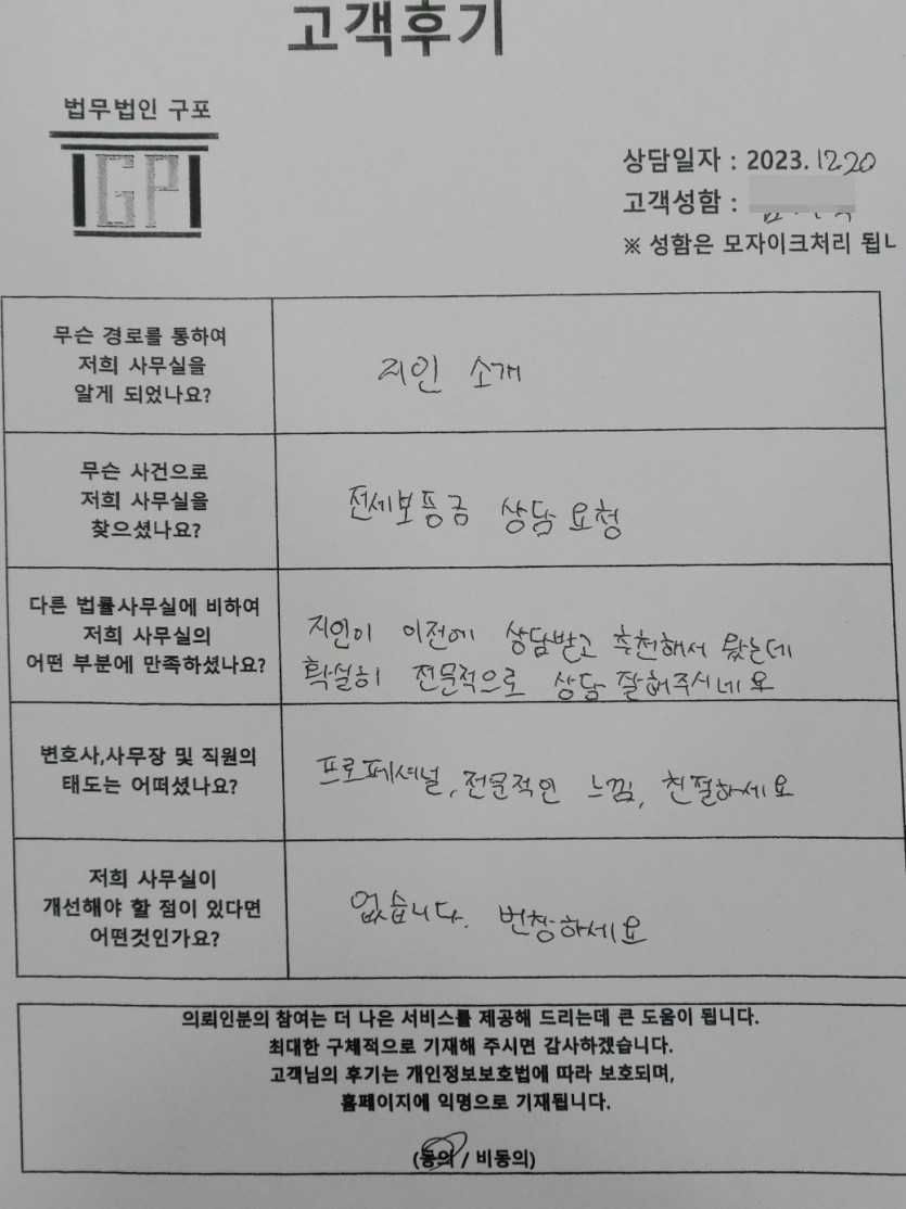 민사(전세보증금반환소송 상담) 의뢰인분의 실제 고객후기