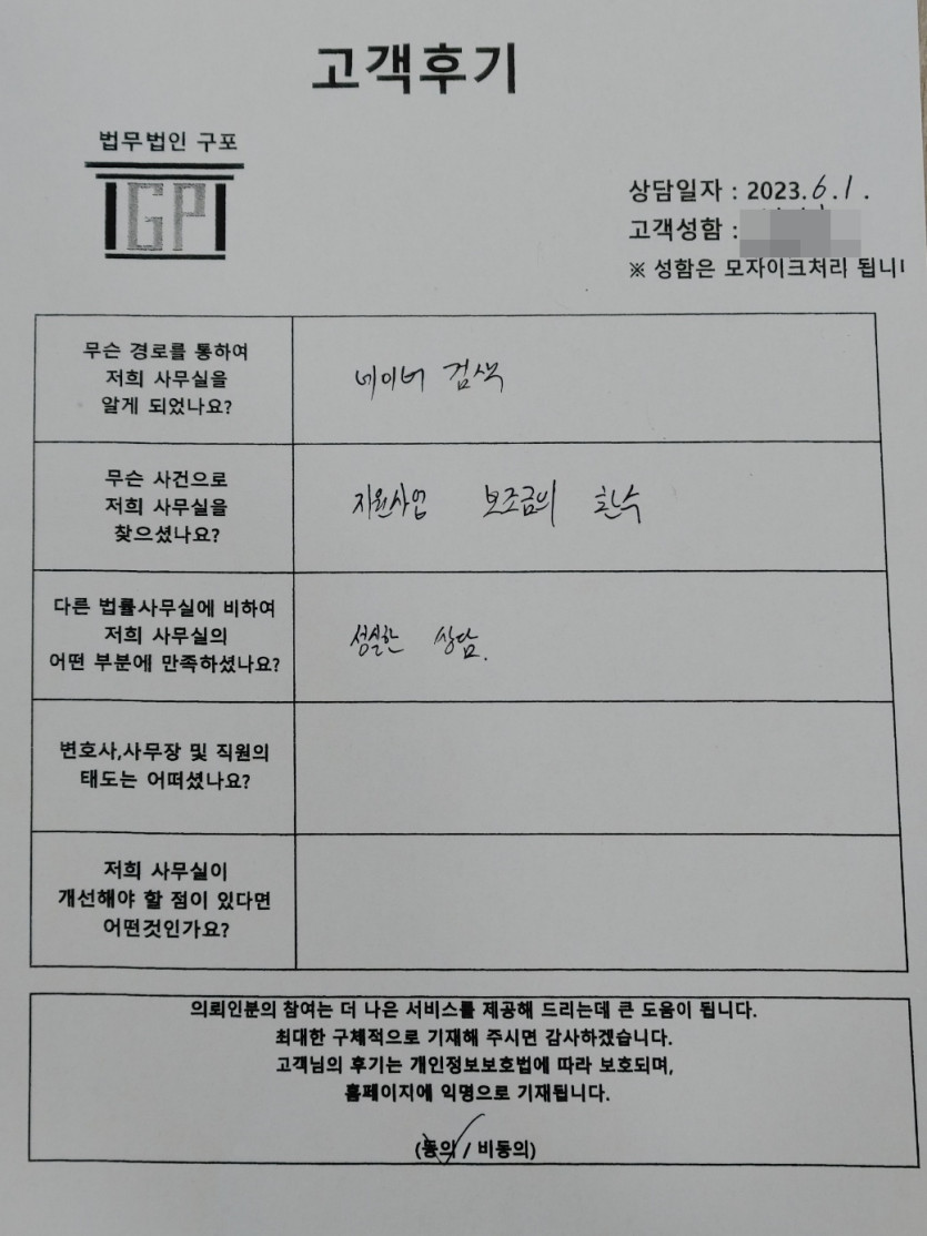 클릭해서 더보기 => 민사(지원사업보조금 환수 상담 ) 의뢰인분의 실제 고객후기