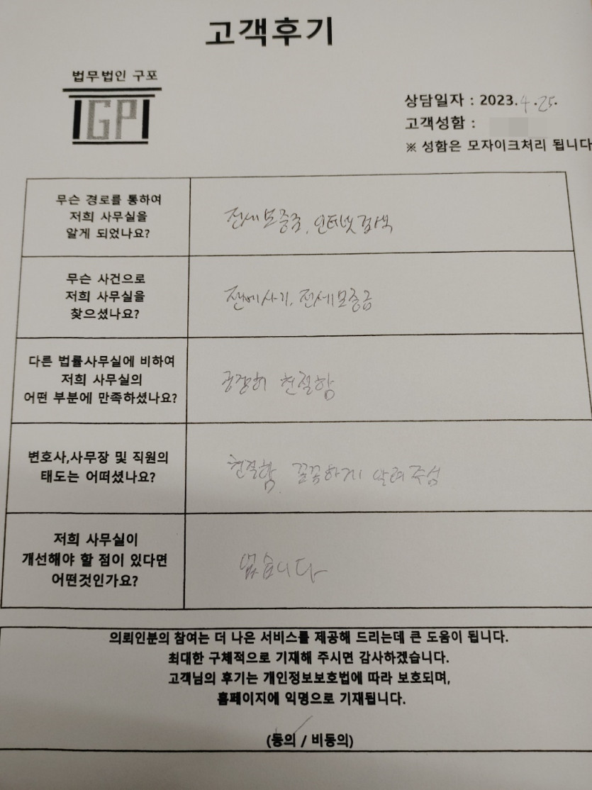 클릭해서 더보기 => 민사(이혼,전세보증금,전세사기) 의뢰인분의 실제 고객후기