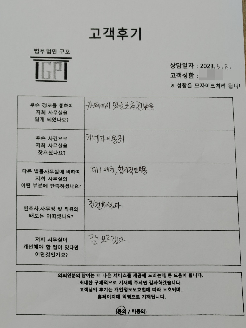 클릭해서 더보기 => 형사(카메라촬영죄 상담 ) 의뢰인분의 실제 고객후기