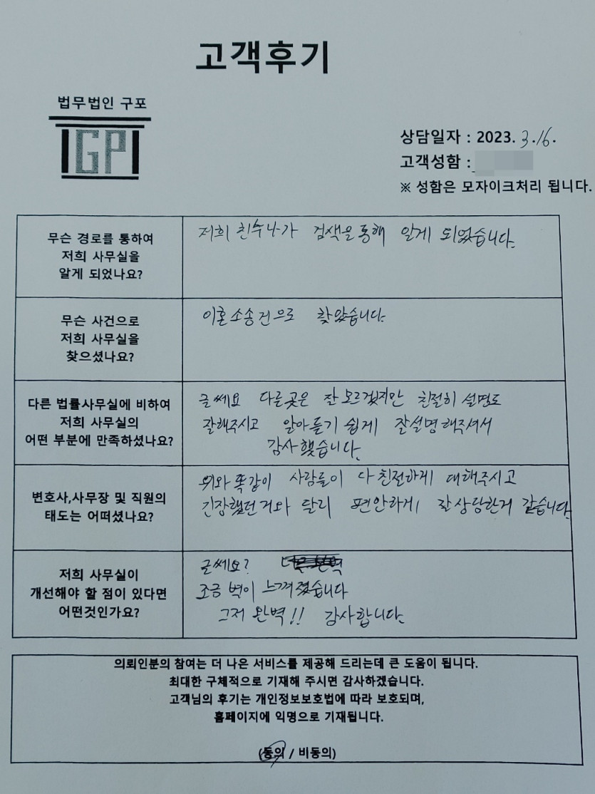 클릭해서 더보기 => 민사(이혼소송 방문상담) 의뢰인분의 실제 고객후기