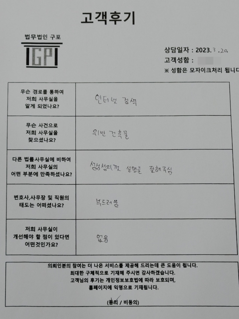 클릭해서 더보기 => 형사(건축물위반 방문상담) 의뢰인분의 실제 고객후기