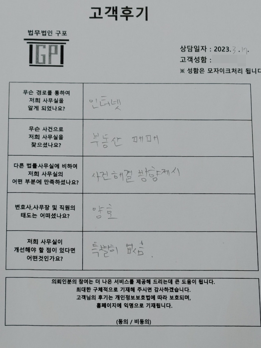 클릭해서 더보기 => 민사(부동산매매 방문상담) 의뢰인분의 실제 고객후기