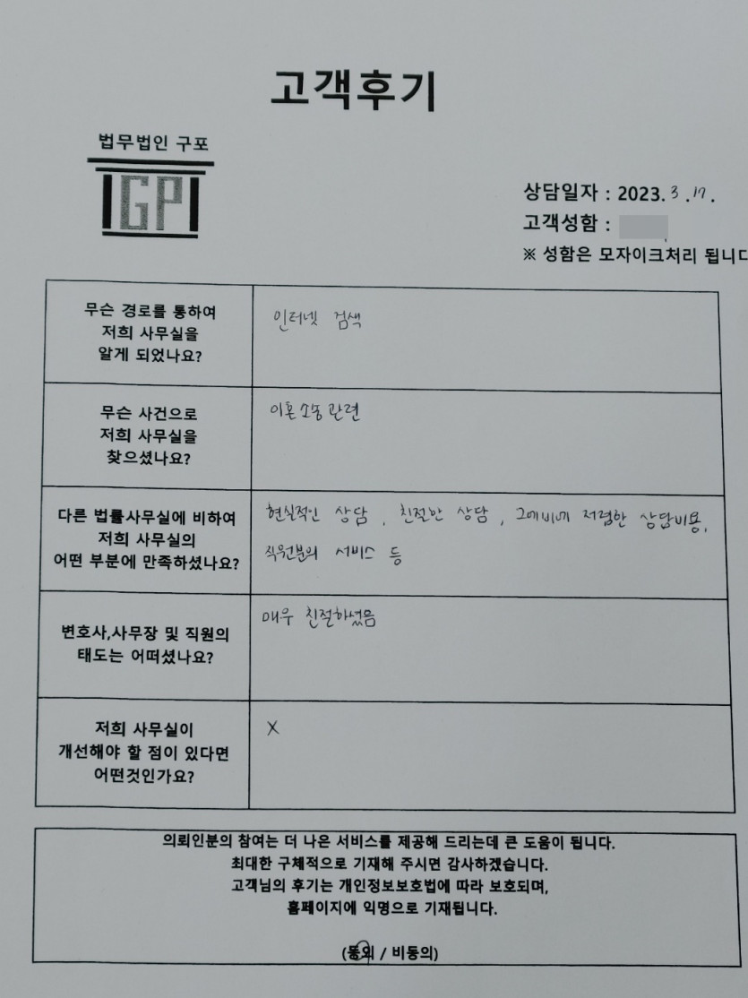 클릭해서 더보기 => 민사(이혼및가정폭력 방문상담) 의뢰인분의 실제 고객후기