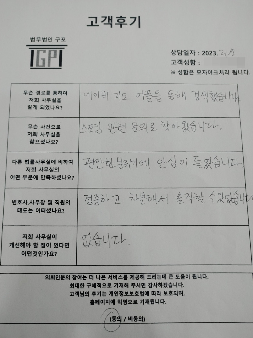 클릭해서 더보기 => 형사(스토킹가해자 방문상담) 의뢰인분의 실제 고객후기