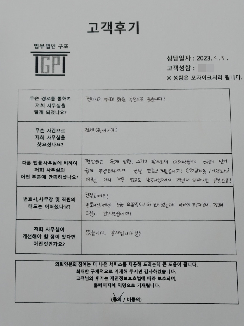 클릭해서 더보기 => 형,민사( 오피스텔 전세사기 방문상담) 의뢰인분의 실제 고객후기