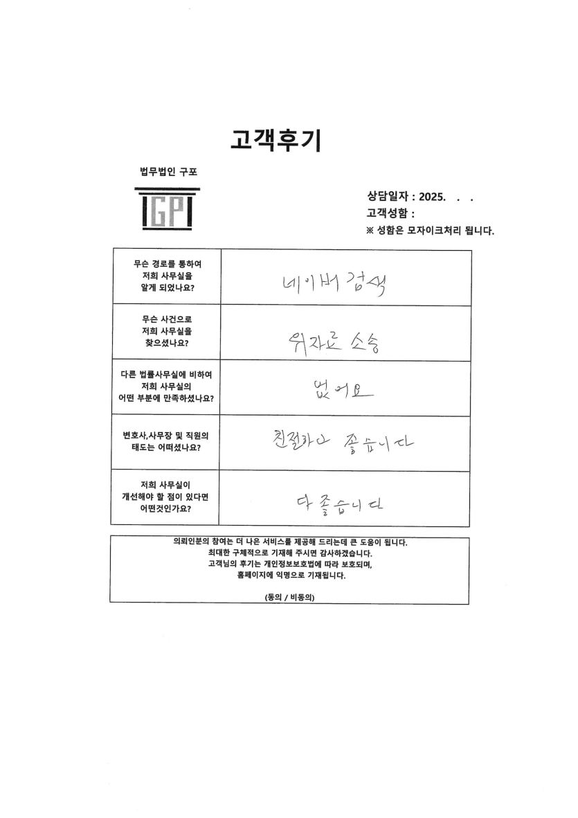 [이혼] 이혼 소송 - 실제 고객님 고객 후기 페이지 정보 최고관리자 작성일25-03-10 목록 본문 안녕하세요. 법무법인 구포입니다.의뢰인분께서 다급하게 당일 상담을 요청하셨으며 다행히 이혼전문변호사분께서 상담을 자세하고 꼼꼼하게 도와드렸습니다.감사합니다. 목록